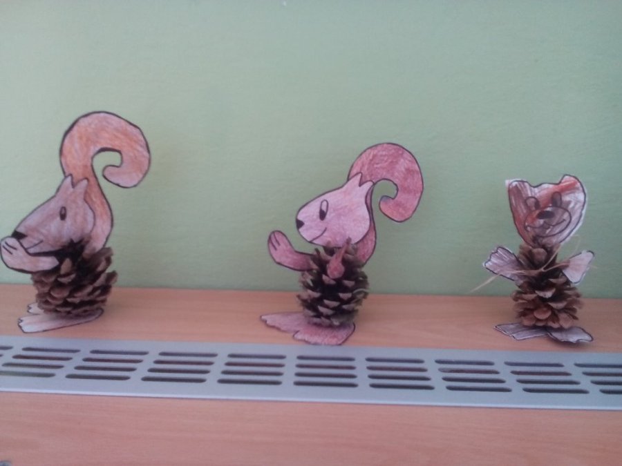 Naše paní oblékla podzimní šaty a ze šišek jsme vyrobili zvířátka z lesa (veverky a medvědy). Děti z vyšších ročníků malovaly výkresy s podzimní tématikou dle své fantazie.