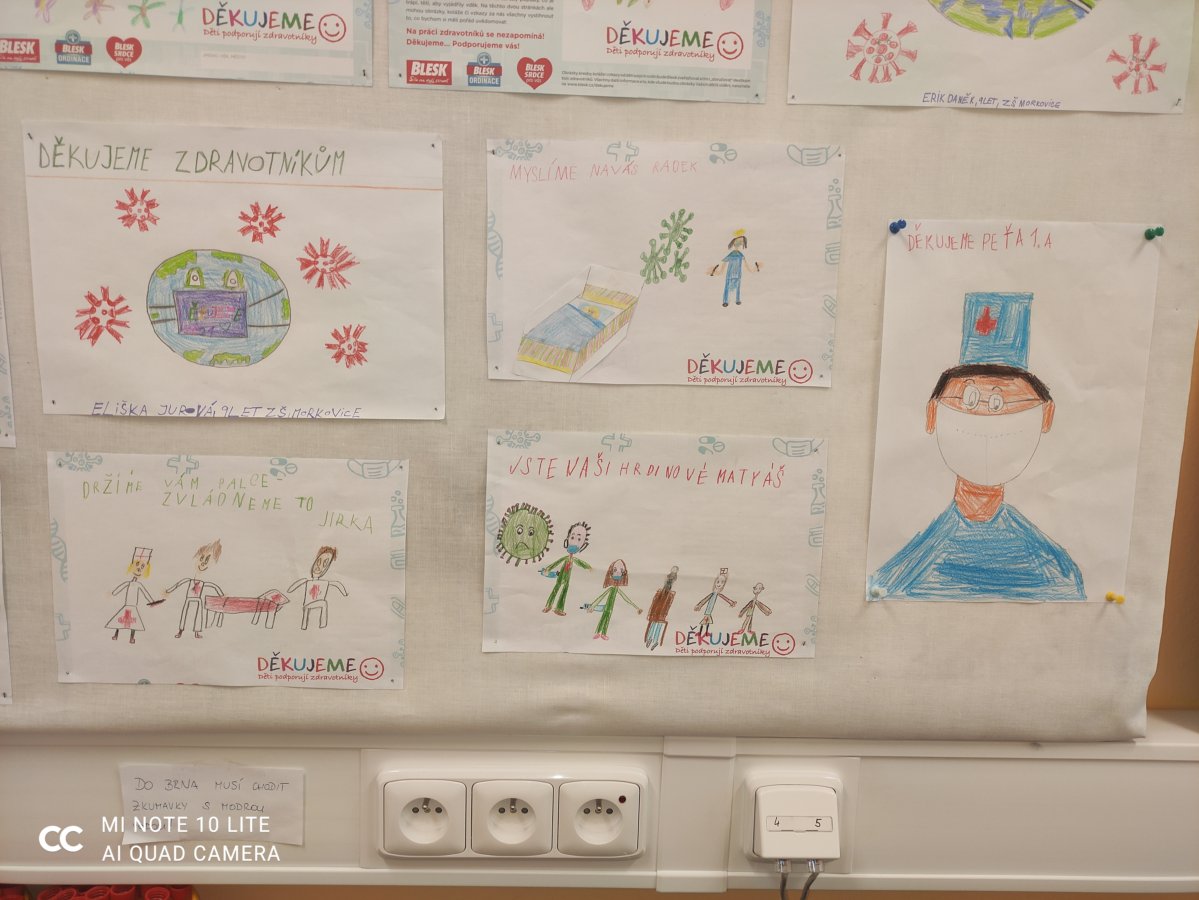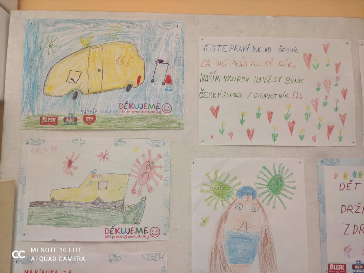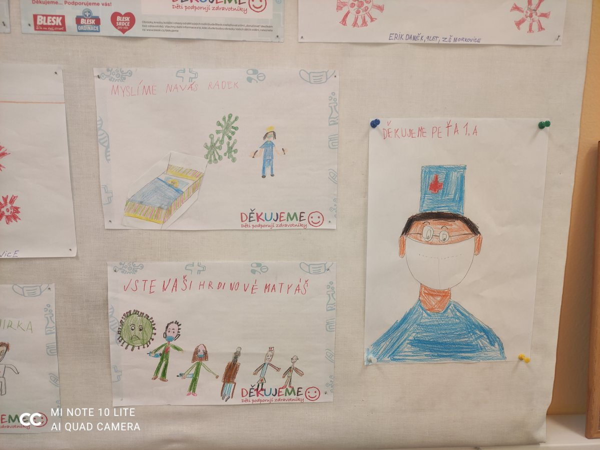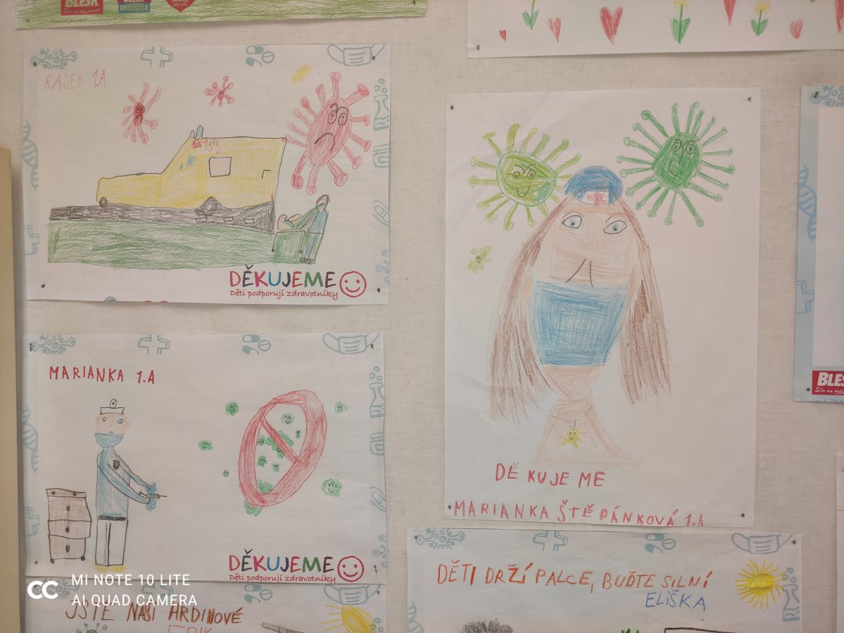 I v době rotační výuky na 1. stupni ZŠ navštěvovaly některé děti školní družinu. V 1. oddělení se střídali žáci z 1.A a ze 3. A. Jsou to děti všímavé a tak i přes svůj věk dobře vědí, co se kolem nich děje. Všechny vnímají situaci, která nastala v souvislosti s korona virovou nákazou. Povídali jsme si o těžké a vyčerpávající práci zdravotníků, o jejich rodinách, které se často bez nich musí obejít, o dlouhém čase, který v nemocnicích věnují péči o spoustu pacientů. A z toho vznikl nápad nakreslit si obrázky ze života zdravotníků a z jejich práce a věnovat je zaměstnancům Kroměřížské nemocnice, aby je potěšily a zlepšily jim náladu. Od nápadu nebylo daleko k činu a tak vznikly krásné obrázky doktorů, sestřiček, sanitek i zdravotnických vrtulníků. Vybrali jsme ty nejhezčí a poslali je zdravotníkům. Dělají teď radost zaměstnancům odběrového místa v areálu Kroměřížské nemocnice.