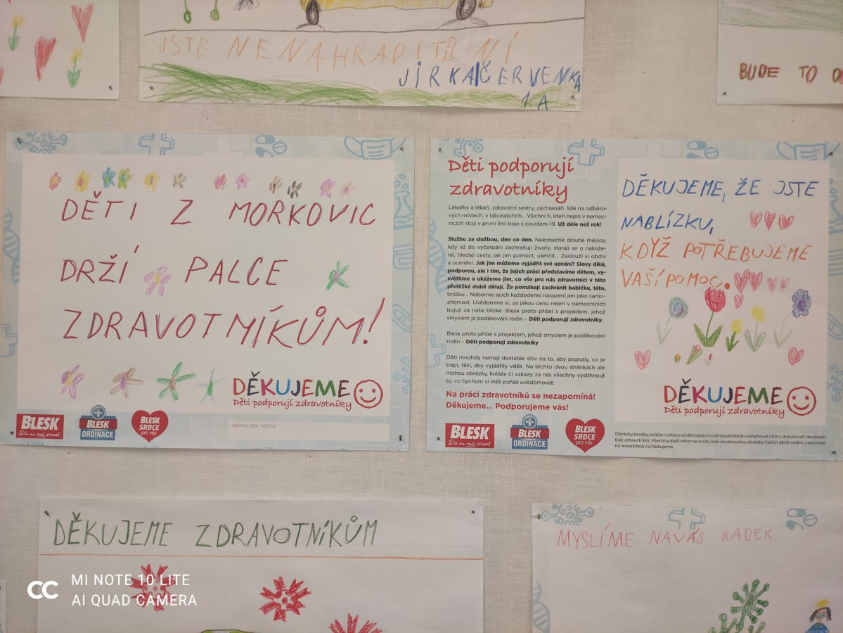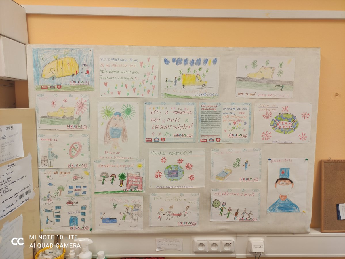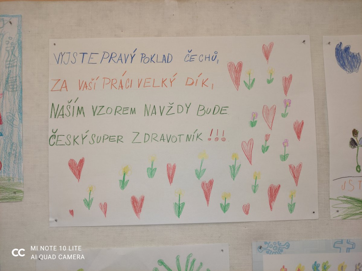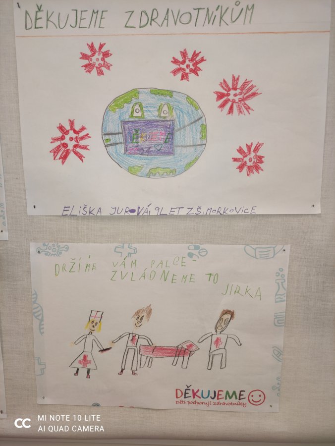 I v době rotační výuky na 1. stupni ZŠ navštěvovaly některé děti školní družinu. V 1. oddělení se střídali žáci z 1.A a ze 3. A. Jsou to děti všímavé a tak i přes svůj věk dobře vědí, co se kolem nich děje. Všechny vnímají situaci, která nastala v souvislosti s korona virovou nákazou. Povídali jsme si o těžké a vyčerpávající práci zdravotníků, o jejich rodinách, které se často bez nich musí obejít, o dlouhém čase, který v nemocnicích věnují péči o spoustu pacientů. A z toho vznikl nápad nakreslit si obrázky ze života zdravotníků a z jejich práce a věnovat je zaměstnancům Kroměřížské nemocnice, aby je potěšily a zlepšily jim náladu. Od nápadu nebylo daleko k činu a tak vznikly krásné obrázky doktorů, sestřiček, sanitek i zdravotnických vrtulníků. Vybrali jsme ty nejhezčí a poslali je zdravotníkům. Dělají teď radost zaměstnancům odběrového místa v areálu Kroměřížské nemocnice.