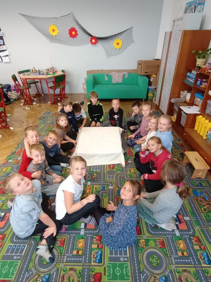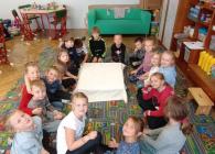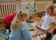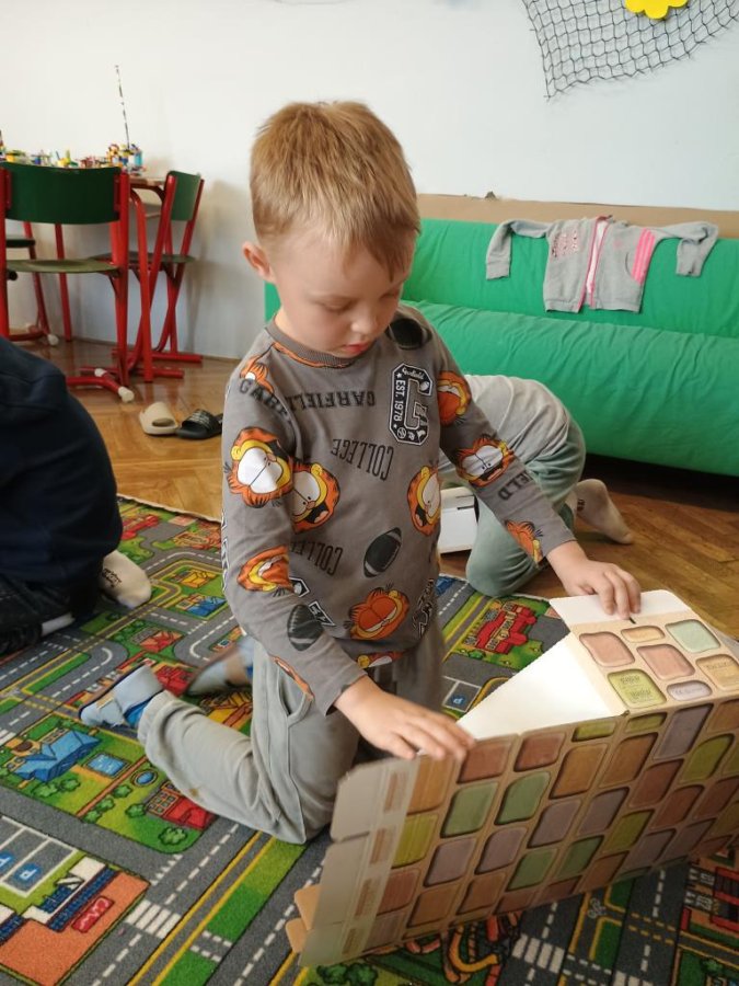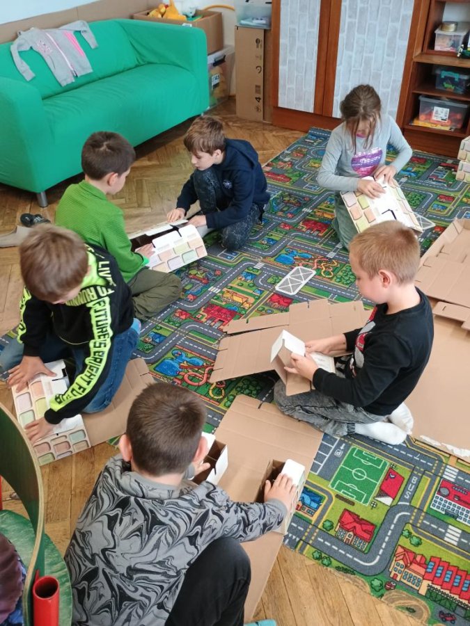 Co to je? Chvíle napětí... a HURÁ!!! Jsou to nové obří kostky. Hned po otevření krabice, si děti věděly rady a začaly sestavovat cihličky. Když byl stavební materiál hotov, z dětí se staly stavitelé a s nadšením se pustily do práce. Postavily si stěny domečku, kde mají svůj soukromý prostor.