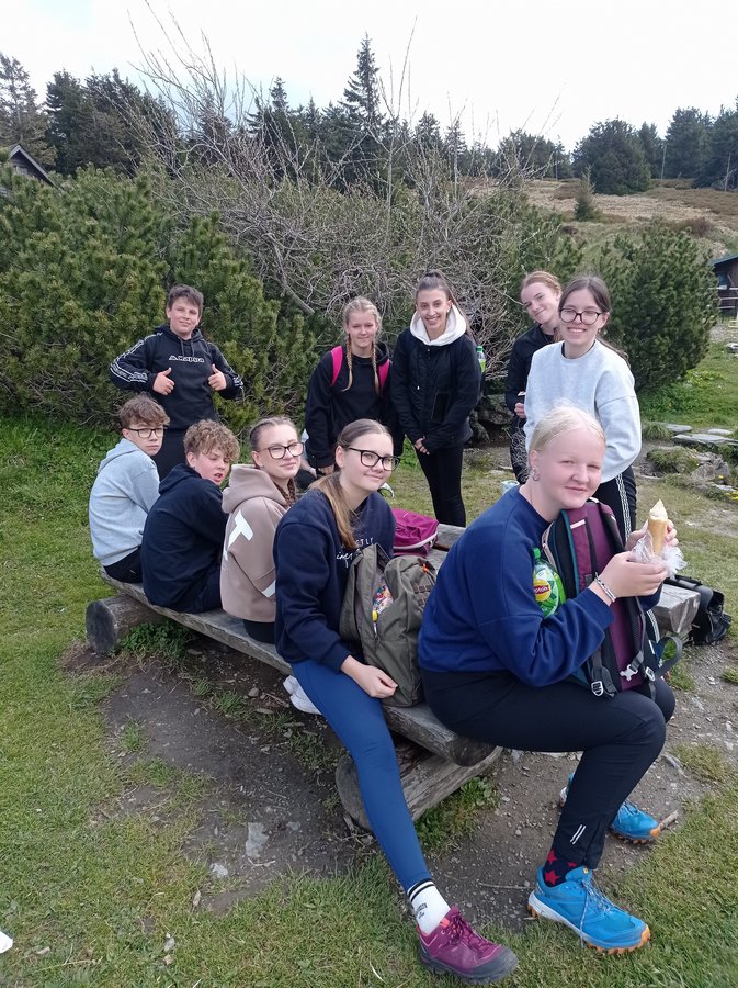 2 den: Druhý den po vzbuzení jsme si dali snídani a po ní se sbalili a vyrazili na túru. Vyšli jsme tři kilometry k chatě Švýcárna, kde jsme si odpočinuli a šli dále na Praděd. Jak jsem došli na Praděd, tak nás vyučující vzali na rozhlednu na vysílači. Poté nás čekala svačina a pokračování naší túry, která vedla po naučné stezce Bílá Opava. Po sejití jsme došli do Karlovy Studánky, kde jsme si zakoupili suvenýry a občerstvení. Dále na nás čekal autobus a cesta domů.