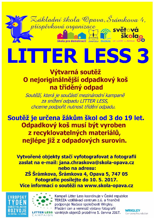 Chlapecké osazenstvo 7.A se zapojilo do soutěže s názvem O nejoriginálnější odpadkový koš na tříděný odpad. Soutěž je součástí mezinárodní kampaně LITTER LESS, která má jako hlavní cíl stanoveno snížení odpadu a také upozornit na nutnost třídění.