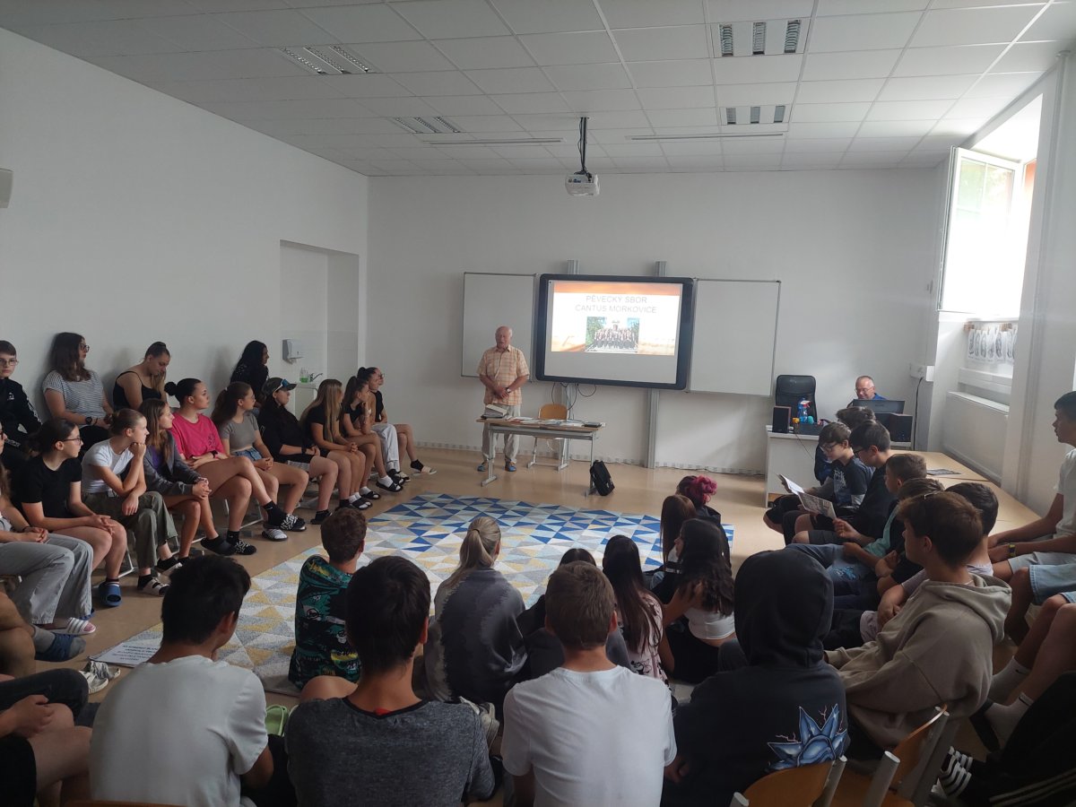 Ve středu ráno 26. června 2024 k nám do ZŠ Morkovice přišel občan Morkovic pan Ing. Vladimír Bleša, který žákům 8. a 9. tříd představil místní pěvecký sbor Cantus. Jsem ráda, že si pan inženýr Bleša osobně s technickým zázemím svého syna udělal čas a vyprávěl o vzniku sboru, o jeho činnosti v minulosti i současnosti. Tento skromný pán, kterého slýcháte hrát na varhany v místním kostele, je mimo sbormistra zmíněného sboru také skladatelem a svou činností mnohonásobně překračuje význam našeho regionu. Pan Ing. Vladimír Bleša nabídl i našim žákyním a žákům možnost zpěvu ve svém sboru Cantus. Například současná druhá sbormistryně sboru začínala se zpěvem v tomto pěveckém tělese již ve svých dvanácti letech. Při založení sboru před 55 lety byl také věkový průměr členů 20 let. Sbor má zkoušky většinou každý pátek od 19h ve víceúčelovém sále Morkovice. Více informací obdržíte přímo u pana sbormistra. Kontakt naleznete na stránkách pěveckého sboru Cantus www.pscantus.cz.