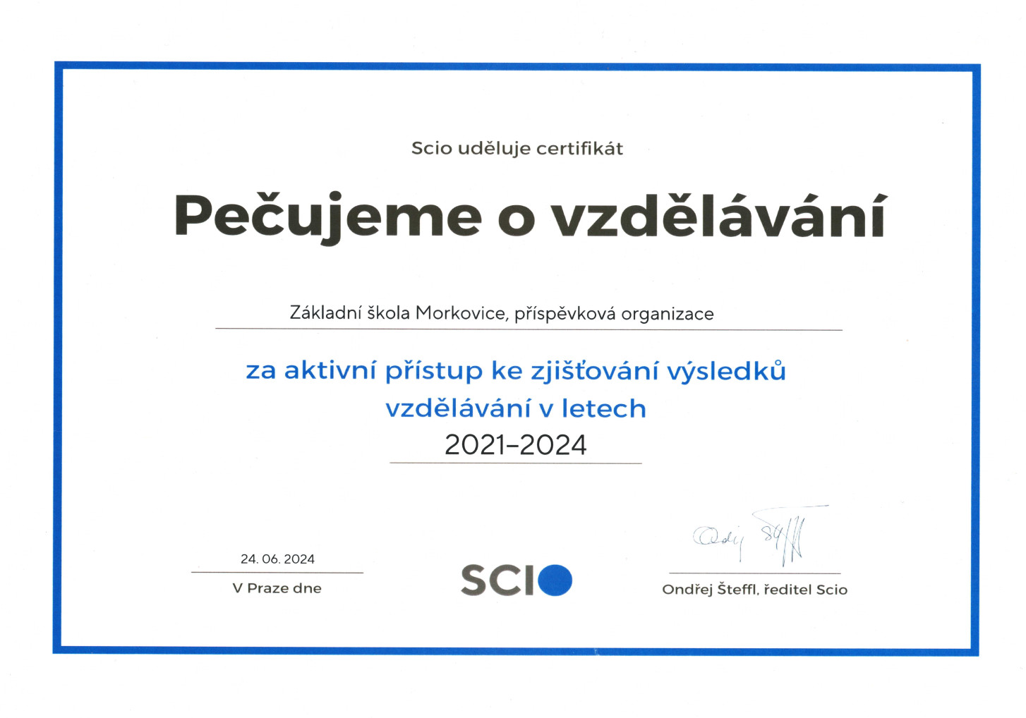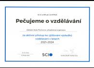 Naše škola získala od společnosti SCIO certifikát Pečujeme o vzdělávání a to za aktivní přístup ke zjišťování výsledků vzdělávání. Zatím posledním počinem v této oblasti byl Trénink na přijímací zkoušky, do kterého se na jaře 2024 zapojilo našich 12 tehdejších osmáků.