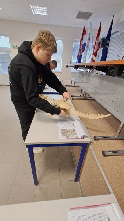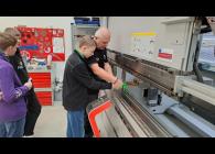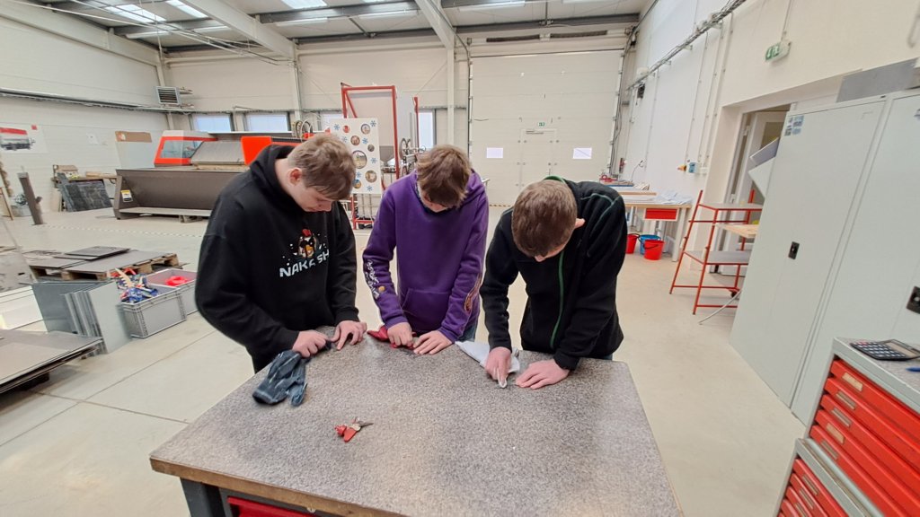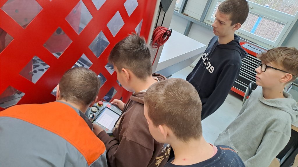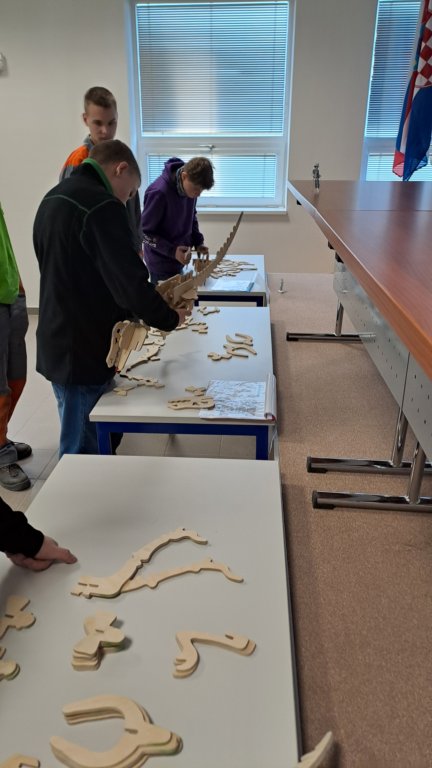 Měli jsme možnost sledovat při práci laserový řezací stroj, který nám podle námi připravených programů vyrobil malé kovové přívěsky na klíče. Dokonce si někteří z nás mohli tento obrovský stroj i chvíli ovládat. Vyzkoušeli jsme si práci s ohraňovacím lisem, vytvořili jsme si výkres dalšího výrobku a naši prostorovou představivost jsme prověřili při skládání 3D modelu pravěkého ještěra. Všichni jsme si nakonec odnesli i malého plechového raka, kterého jsme vybavili drobným kamínkem a upravili mu nožičky.